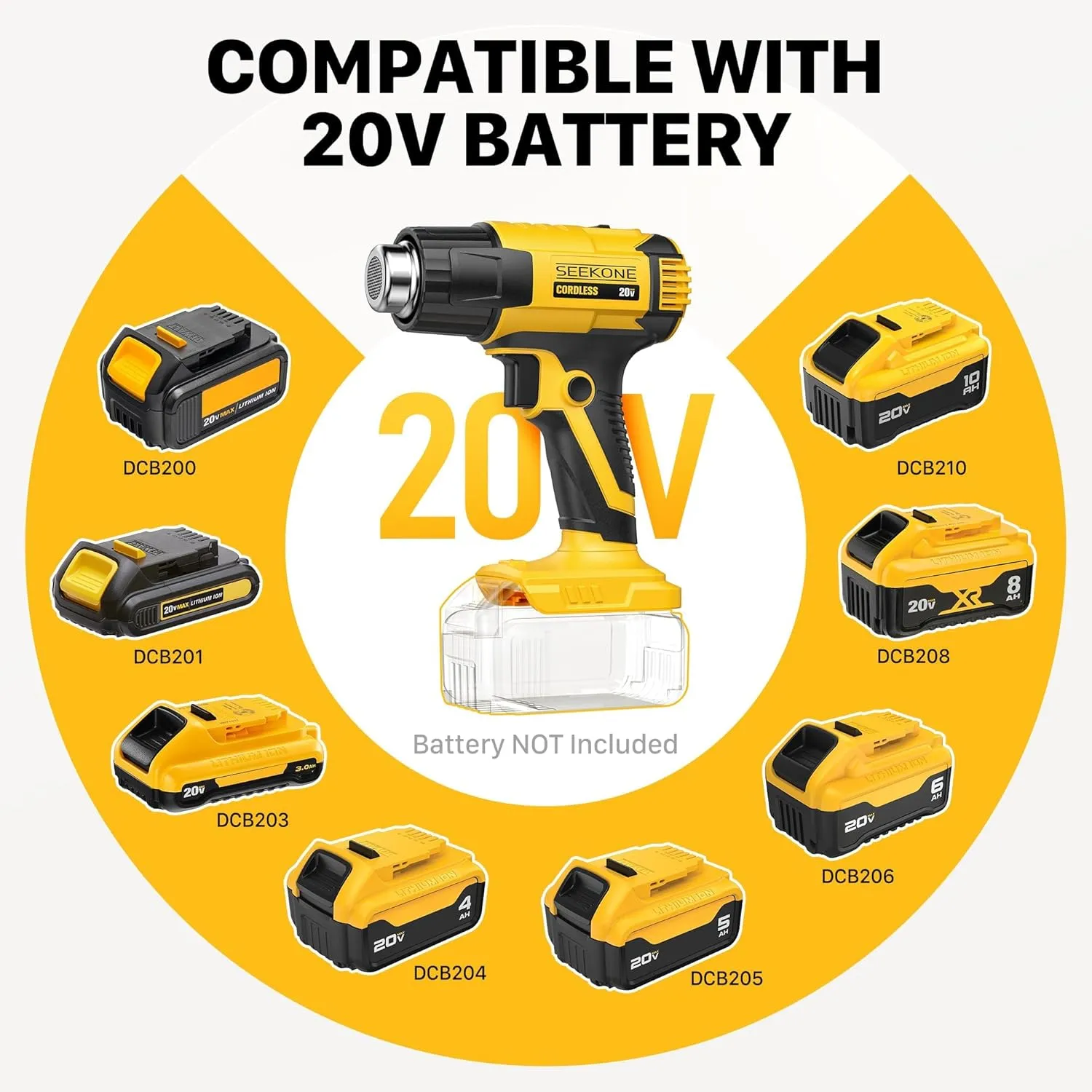 Cordless Freedom & High Power The SEEKONE SCE550 Cordless Heat Gun allows you to completely break free from the constraints of power cords. Specifically designed to be compatible with 20V batteries, it provides robust power for outdoor projects, high-altitude work, or areas with limited access to electricity. Whether for vinyl wrapping, heat shrink tubing, or outdoor repairs, it delivers performance comparable to corded heat guns.